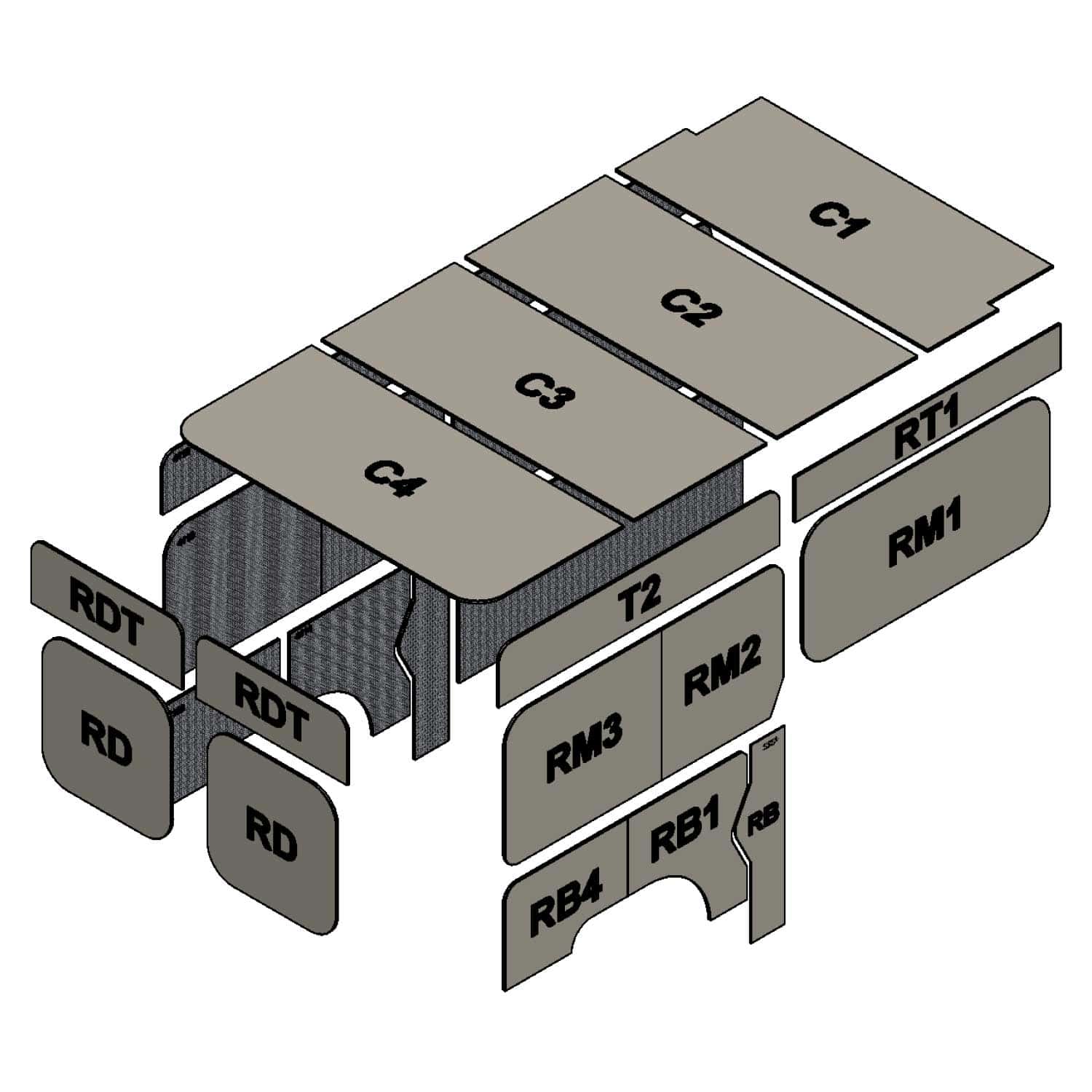 Each part is labeled with a printed alphanumeric code that indicates its specific location and position on the vehicle.
